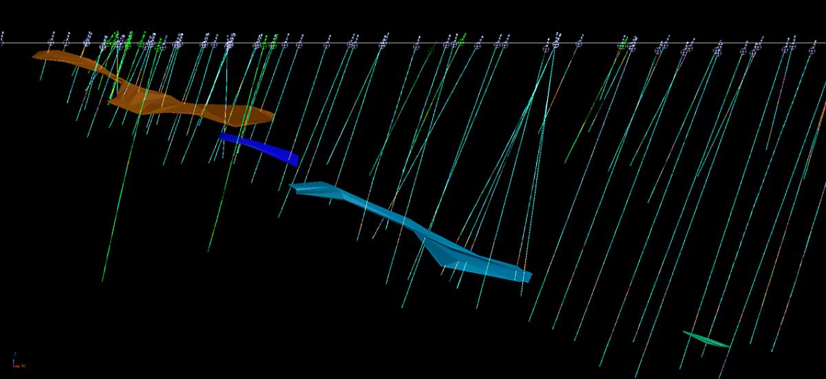 Kuva 3. In-house 3D-malli Saramäen mineralisaatiosta, katselusuunta koilliseen. Ruskea = pintamineralisaatio, sininen = keskimineralisaatio, vaaleansininen = syvämineralisaatio ja vihreä = syvälinssimineralisaatio. Pystyviivat edustavat tehtyjä kairauksia.