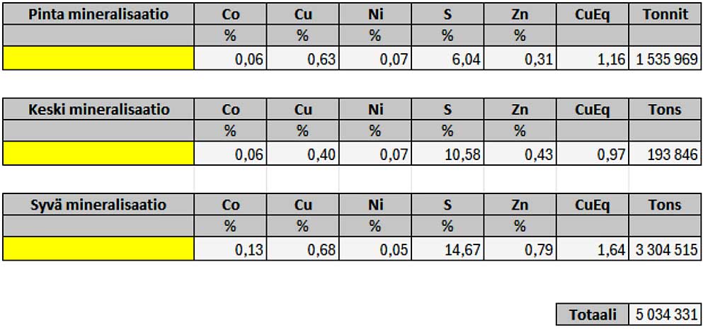 FinnCobalt on tehnyt olemassa olevan analyysidatan ja vanhojen raporttien pohjalta alustavan resurssiarvion Saramäen mineralisaatiosta. Arvio perustuu kairasydännäytteisiin, joita on kairattu Saramäestä ja sen lähialueilta yhteensä 36 kilometrin verran vuosina 1970–2018.